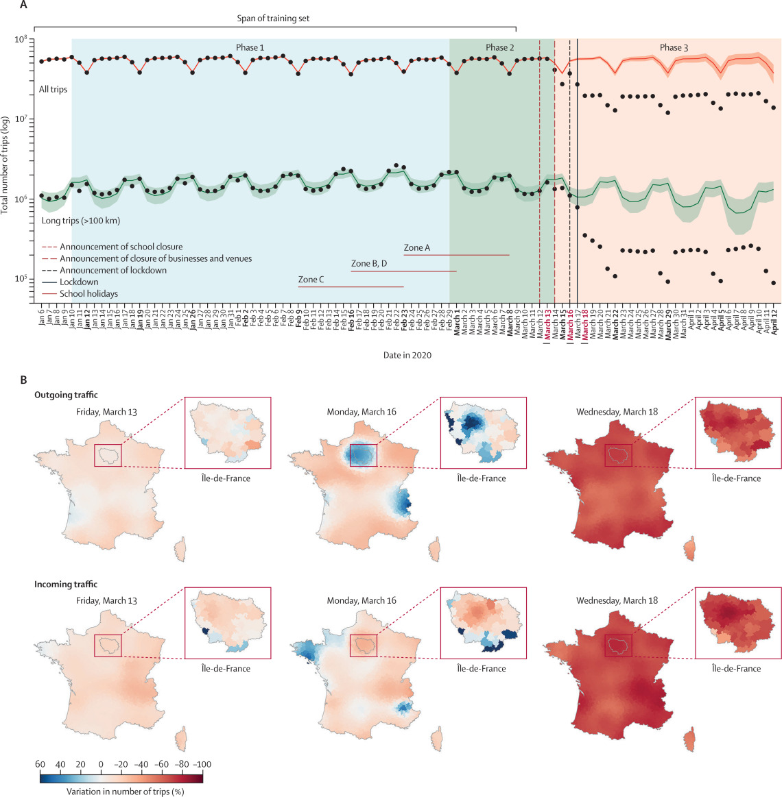 For this population-based study, we used temporally resolved travel flows among 1436 administrative areas of mainland France reconstructed from mobile phone trajectories. Data were stratified by age class (younger than 18 years, 18–64 years, and 65 years or older). We distinguished between residents and non-residents and used population data and regional socioeconomic indicators from the French National Statistical Institute. We measured mobility changes before and during lockdown at both local and country scales using a case-crossover framework. We analysed all trips combined and trips longer than 100 km (termed long trips), and separated trips by daytime or night-time, weekdays or weekends, and rush hours.