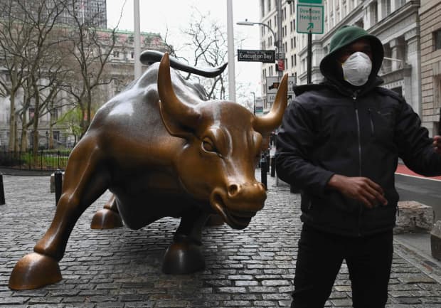 A man wearing a face mask takes a selfie at the Charging Bull statue.