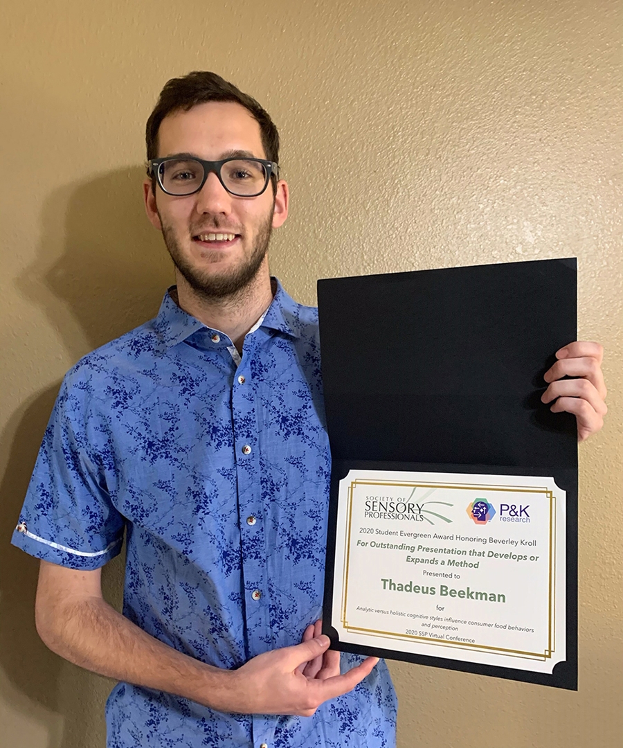Beekman, who is working on his Ph.D. in food science, was one of three presenters, oral or poster, to win a Society of Sensory Professionals Evergreen Award. He presented a virtual eposter on his research, “Analytic Versus Holistic Cognitive Styles Influence Consumer Food Perception and Behavior.”