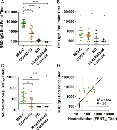 METHODS: From March 17, 2020, to May 26, 2020, we prospectively identified hospitalized children with MIS-C (n = 10), symptomatic COVID-19 (n = 10), and KD (n = 5) and hospitalized controls (n = 4) at Children’s Healthcare of Atlanta. With institutional review board approval, we obtained prospective and residual blood samples from these children and measured SARS-CoV-2 spike receptor-binding domain (RBD) immunoglobulin M and immunoglobulin G (IgG), full-length spike IgG, and nucleocapsid protein antibodies using quantitative enzyme-linked immunosorbent assays and SARS-CoV-2 neutralizing antibodies using live-virus focus-reduction neutralization assays. We statistically compared the log-transformed antibody titers among groups and performed linear regression analyses.