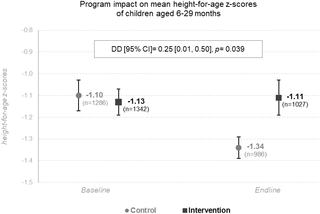 In 2014, the government of Togo implemented a pilot unconditional cash transfer (UCT) program in rural villages that aimed at improving children’s nutrition, health, and protection. It combined monthly UCTs (approximately US$8.40 /month) with a package of community activities (including behavior change communication [BCC] sessions, home visits, and integrated community case management of childhood illnesses and acute malnutrition [ICCM-Nut]) delivered to mother–child pairs during the first “1,000 days” of life. We primarily investigated program impact at population level on children’s height-for-age z-scores (HAZs) and secondarily on stunting (HAZ < −2) and intermediary outcomes including household’s food insecurity, mother–child pairs’ diet and health, delivery in a health facility and low birth weight (LBW), women’s knowledge, and physical intimate partner violence (IPV).