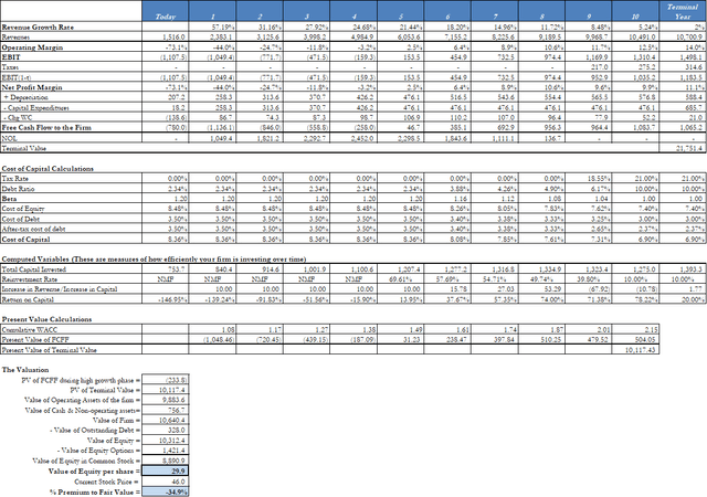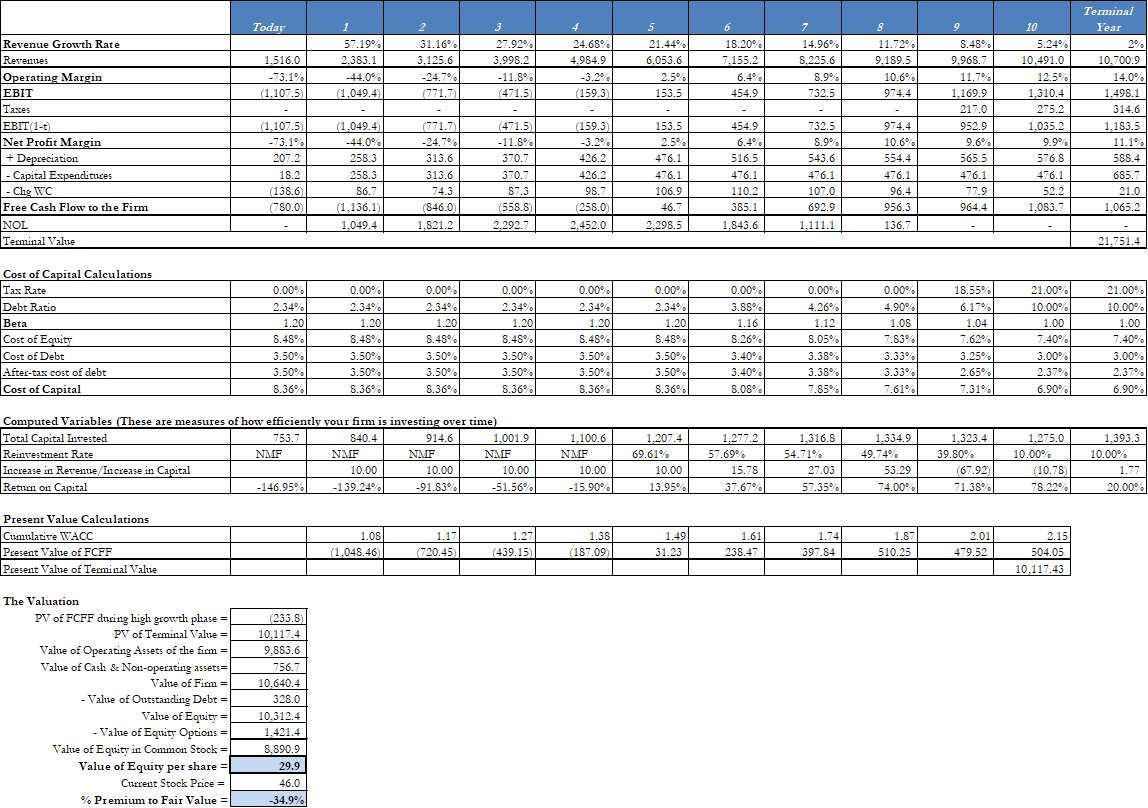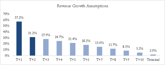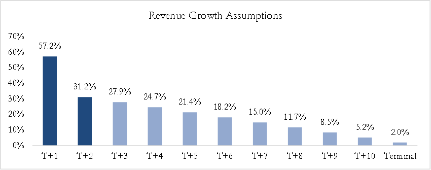First, ran a 10-year, 2-stage DCF where we assumed consensus revenue growth for the next 2 years, then trailed it down linearly towards 2% in year 10 resulting in the following growth path which implies a 21% 10-year revenue CAGR: