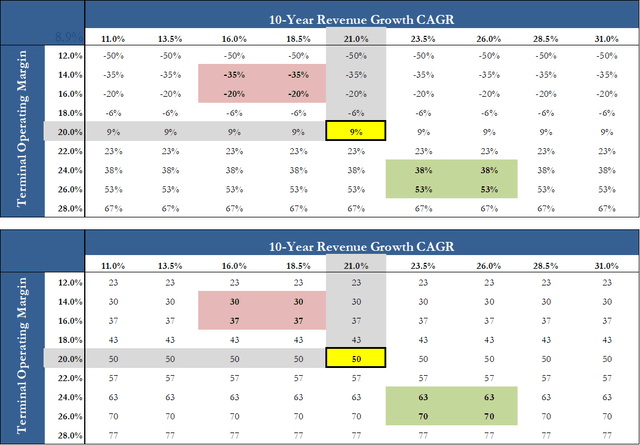 The above represents our Base valuation scenario, we present Bull/Bear scenarios and illustrate a sensitivity analysis of our core revenue growth and terminal operating margin assumptions below.