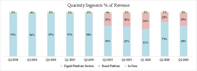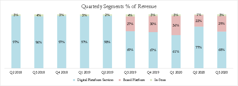 In Q3 2019, the company started reporting revenues from the brand platform as a separate segment, it is gradually expanding as a percentage of total revenues. This segment represents recurring, subscription revenues, much in the same way Shopify (SHOP) provides an eCommerce platform for merchants. This is the most exciting aspect of Farfetch’s business and what investors should watch closely given how SaaS platform businesses command significantly greater revenue multiples vs. pure-play online retailers.