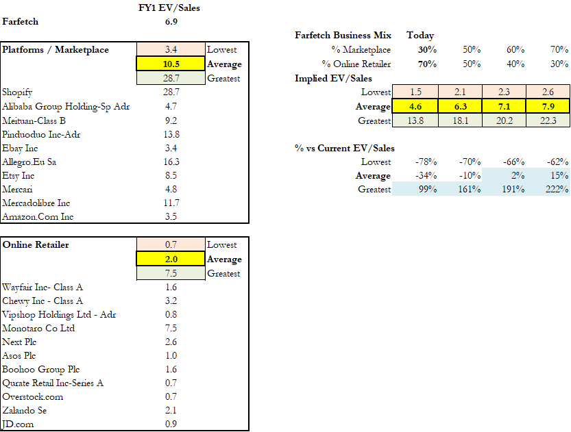 The following tables highlight the FY1 EV/Sales multiples observed on platform/marketplace companies vs. those of pure-play online retailers. We also highlight how Farfetch could be valued as it expands the percentage of Marketplace revenue it earns – these calculations indicate the market expects Farfetch to transition towards 60/40 mix of Marketplace/Online revenues assuming the comps below:Source: Bloomberg estimates, author’s calculations