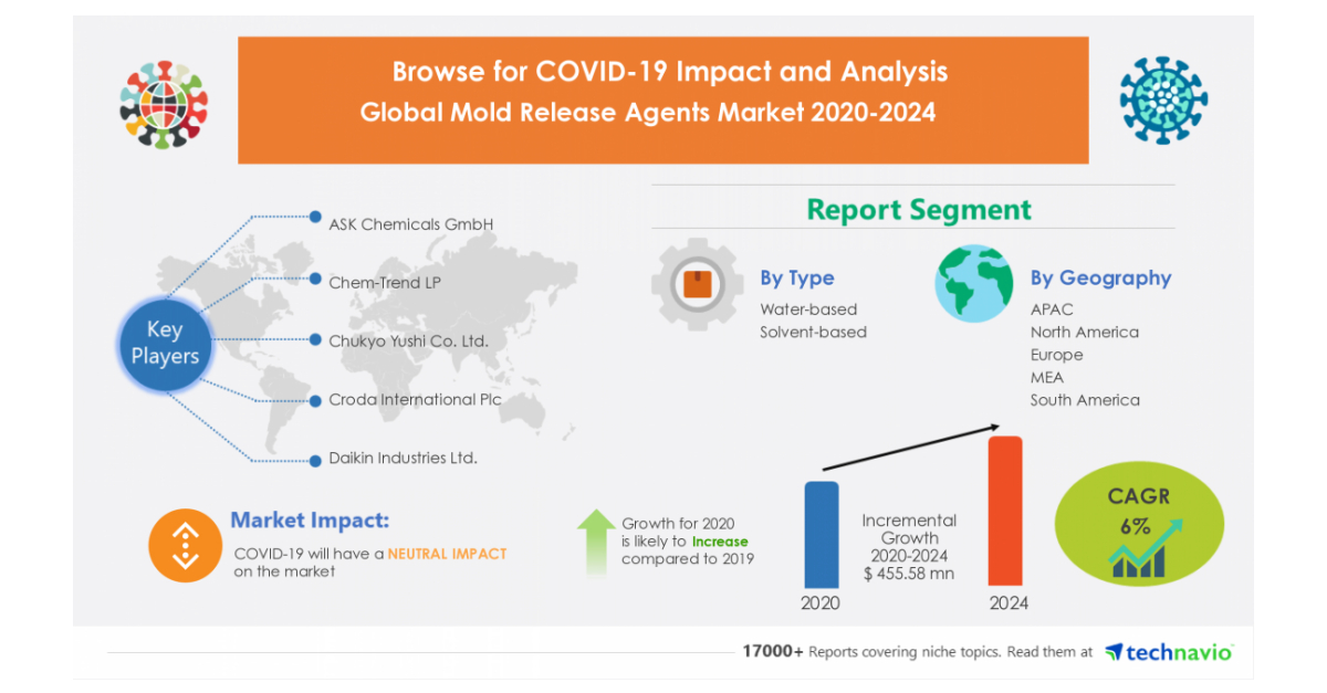 LONDON–(BUSINESS WIRE)–The mold release agents market is expected to grow by USD 455.58 million during 2020-2024, according to Technavio. The report offers a detailed analysis of the impact of the COVID-19 pandemic on the mold release agents market in optimistic, probable, and pessimistic forecast scenarios.