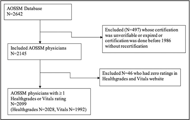 This study did not require institutional review board approval because it only used publicly available web-accessible data sources. The American Orthopaedic Society for Sports Medicine (AOSSM)14 member directory was accessed from June 1, 2017, to July 30, 2017. A list was compiled of 2642 AOSSM physicians (MD or DO), noting their name and state of practice. Board certification and sports CAQ status were verified using the ABOS physician database.15 After application of the exclusion criteria, a total of 2099 surgeons was available for review (Figure 1). The authors excluded surgeons certified before 1986 without any board recertification because recertification was not required before 1986, thus preventing determination of current practice status.
