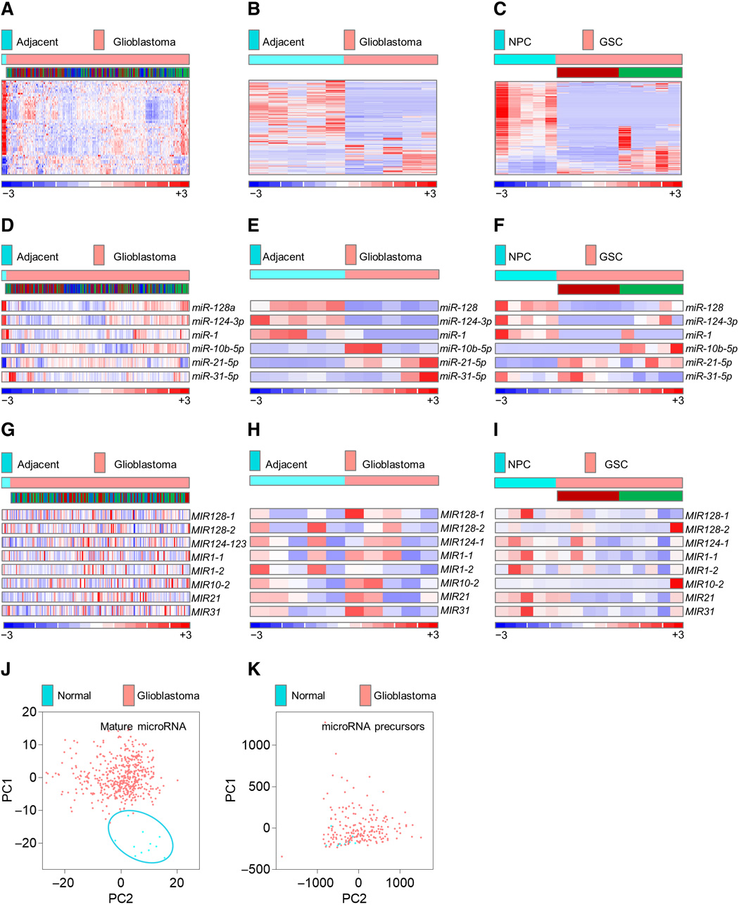 (A) Mature microRNAome in patients with glioblastoma (n = 490) versus healthy individuals (n = 11), based on 535 microRNAs in the TCGA database. The subtype identity: red, mesenchymal; blue, classical; green, proneural. (B and C) Mature microRNAome in glioblastoma tissue versus adjacent, nonpathological brain (n = 5 each) (B), and in GSCs (n = 5 per subtype) versus NPCs (n = 5) (C) based on 581 and 605 of 799 microRNAs by nCounter NanoString platform. GSC’s subtype identity is shown (red, mesenchymal; green, proneural). (D) Selected mature microRNAs in patients with glioblastoma (n = 490) versus healthy individuals (n = 11), based on the TCGA database. For the subtype identity, see (A). (E and F) Selected mature microRNAs in glioblastoma tissue versus adjacent, nonpathological brain (n = 5 each) (E), and in GSCs (n = 5 per subtype) versus NPCs (n = 5) (F), based on nCounter NanoString platform. For GSC’s subtype identity, see (B) and (C). (G) Selected microRNA precursors in patients with glioblastoma (n = 195) versus healthy individuals (n = 10), based on the TCGA database. For the subtype identity, see (A). (H and I) Selected microRNA precursors in glioblastoma tissue versus adjacent, nonpathological brain (n = 5 each) (H), and in GSCs (n = 5 per subtype) versus NPCs (n = 5) (I), based on custom NanoString precursor platform. For GSC’s subtype identity, see (B) and (C). (J and K) Mature microRNAome but not microRNA precursors distinguish between patients with glioblastoma and healthy individuals. PCA of mature (J) and precursors (K) microRNA in patients with glioblastoma (red dots, n = 490 and n = 205) versus healthy individuals (blue dots, n = 10) [(J) and (K), respectively].