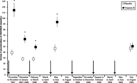 Geometric mean (95% CI) serum concentrations of 25(OH)D in the placebo and vitamin D group over the duration of the study. Arrows indicate when the bolus dose of vitamin D or placebo was administered. *P < .001 for difference between placebo and vitamin D.