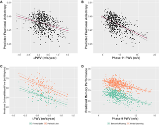 Plots present estimated marginal means for (A, B) Predicted global FA, (C) Predicted CBF from frontal (green) and parietal (orange) lobes, and (D) Predicted memory performance on semantic fluency (green) and verbal learning (orange) tests, plotted against (A,C) Rate of change of PWV, (B) PWV at Phase 11, and (D) PWV at Phase 9. Estimated marginal means are derived from linear regression models adjusted for age, MAP, BMI, and antihypertensive treatment measured at the respective phase (9 or 11), number of years from the respective phase (9 or 11) to the MRI scan, and sex, education, socioeconomic status, and MRI scanner model. BMI, body mass index; CBF, cerebral blood flow; FA, fractional anisotropy; MAP, mean arterial pressure; MRI, magnetic resonance imaging; PWV, pulse wave velocity.