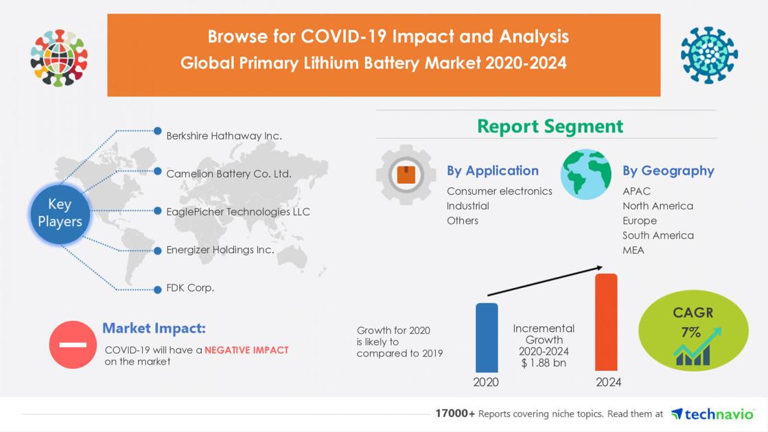 The primary lithium battery market is expected to grow by USD 1.88 billion during 2020-2024, according to Technavio. The report offers a detailed analysis of the impact of the COVID-19 pandemic on the primary lithium battery market in optimistic, probable, and pessimistic forecast scenarios.