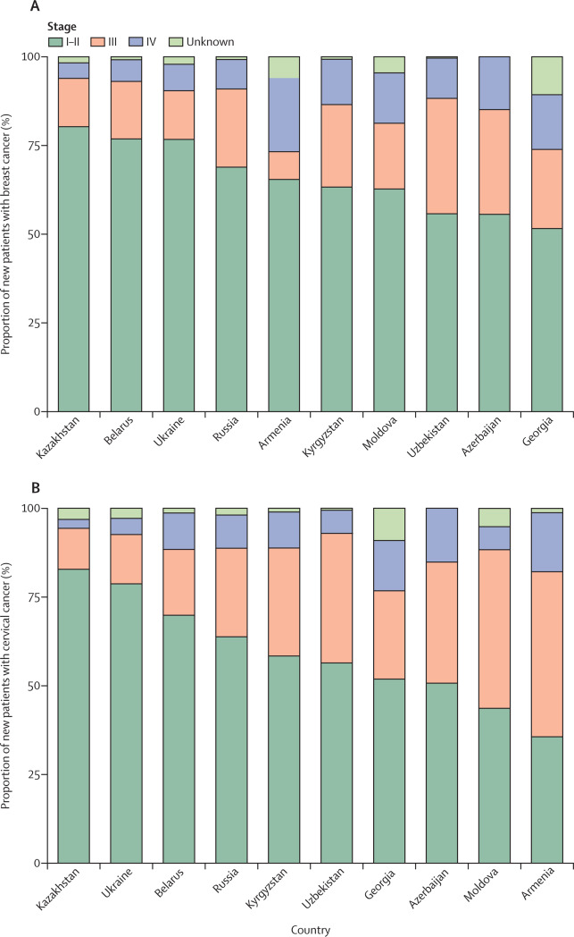 Our results suggest modest progress in early detection of breast cancer in the newly independent states of the former Soviet Union. The high proportions of early-stage disease in the absence of mammography screening (eg, in Belarus) provide a benchmark for what is achievable with rapid diagnosis. For cervical cancer, there is a need to tackle the high burden and unfavourable stage-specific changes over time in the region. A radical shift in national policies away from opportunistic screening toward organised, population-based, quality-assured human papillomavirus vaccination and screening programmes is urgently needed.