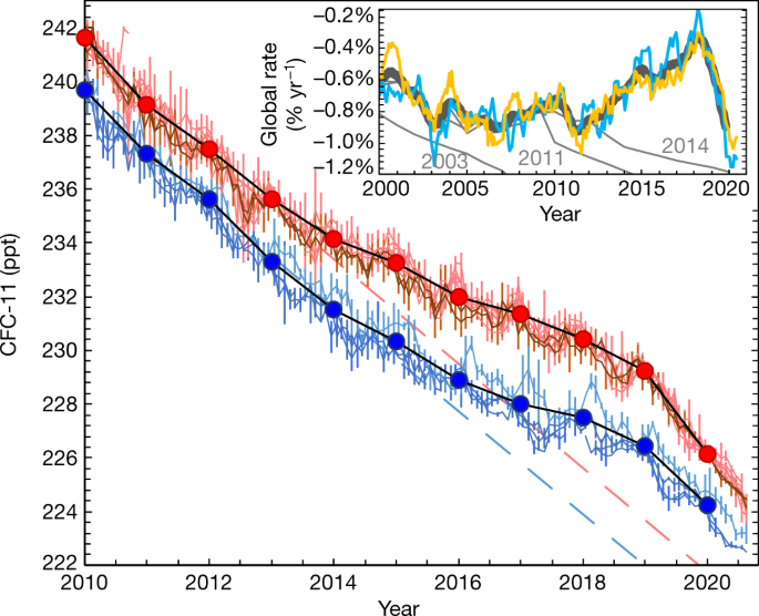 Ambient air measurements of CFCs were obtained by two independent global networks, the NOAA and the AGAGE, at a total of thirteen unique surface sites throughout the globe using multiple techniques1,3,27,28 (Extended Data Table 1). Multiple approaches are taken to reduce any local emissive influences on estimates of background atmospheric CFC mole fractions and their change over time. These approaches include considering monthly medians instead of means for on-site results at remote NOAA sites, a statistical filter to derive pollution-free monthly means30, visual inspection, consideration of back-trajectories, and only using flask results obtained when air was from a pre-specified clean air sector. Variability (1 s.d.) since 2010 in measured monthly mean mole fractions averaged 0.2−0.5 ppt for NOAA GCMS flask analysis and 0.2−0.4 ppt for AGAGE in situ electron capture detection measurements, depending on site.