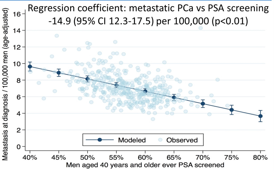 To do so, the authors used the North American Association of Central Cancer Registries to determine age-adjusted incidences of metastatic prostate cancer at diagnosis per 100,000 men between 2002 – 2016 for each state. The authors then used the Behavioral Risk Factor Surveillance System, which collects this information for men at least 40 years of age every 2 years from 2002 onward, to determine state-level survey-weighted estimates of PSA screening. PSA screening and metastasis data were collated as a multi-panel time series and then analyzed using a random-effects linear regression model with random effects at the state level.