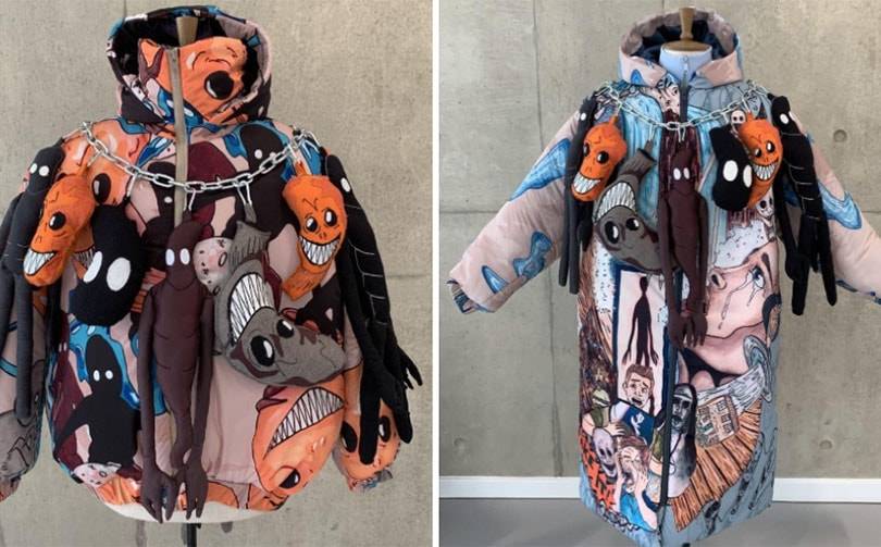 My signature pieces are the long mix dream puffa coat that includes a snippet of everyone’s dreams within the print, alongside the dream stealer puppets attached with industrial chains. I wanted my dream stealers to bring to life my print and bring a sense of joy to my collection. They are the distorted figures people have experienced in their nightmares, the aim was by turning them into stuffed puppets it eliminates that fear and replaces it with happiness.